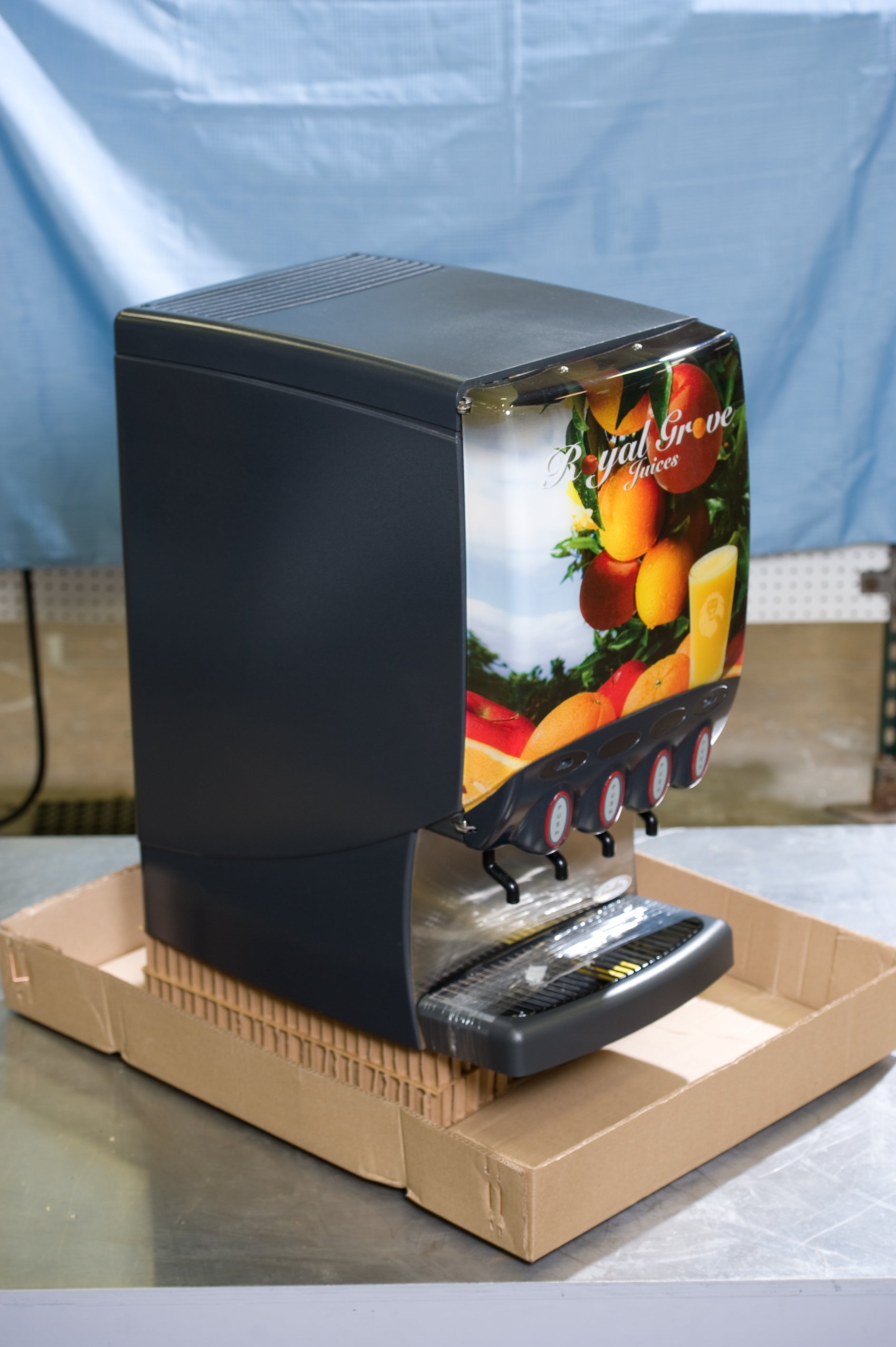 | Capable of holding (4) 3.5 L bottles of concentrate, you can avoid having to constantly refill the beverages. A sold out indicator light will notify you when you've run out of product. When you do need to re-load the machine it is very simple as everything is controlled from the front of the unit with easy access. Temperature control is also kept within reach for any necessary adjustments. A large ice bank can hold 14-16 lb. of ice and will ensure drinks are kept cold during peak demand. The optional flush feature will speed up maintenance and increase the cleanliness of your dispensing system. Plus, the efficient mixing system provides more consistent drinks with less no slugging or dripping. This unit requires a 115V electrical connection for operation |