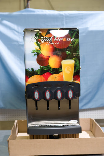 | Capable of holding (4) 3.5 L bottles of concentrate, you can avoid having to constantly refill the beverages. A sold out indicator light will notify you when you've run out of product. When you do need to re-load the machine it is very simple as everything is controlled from the front of the unit with easy access. Temperature control is also kept within reach for any necessary adjustments. A large ice bank can hold 14-16 lb. of ice and will ensure drinks are kept cold during peak demand. The optional flush feature will speed up maintenance and increase the cleanliness of your dispensing system. Plus, the efficient mixing system provides more consistent drinks with less no slugging or dripping. This unit requires a 115V electrical connection for operation |