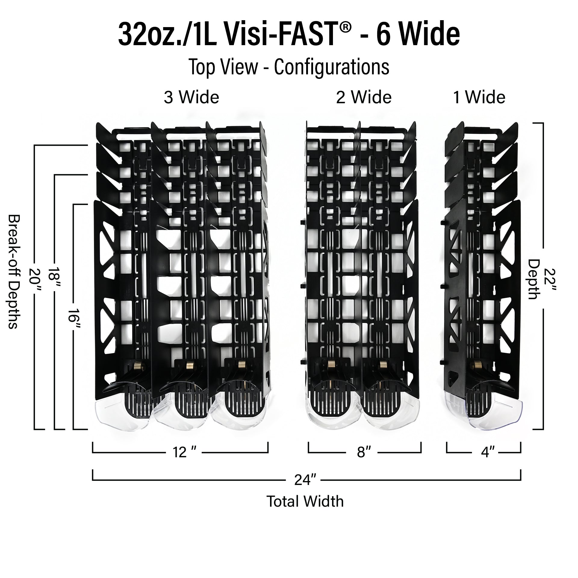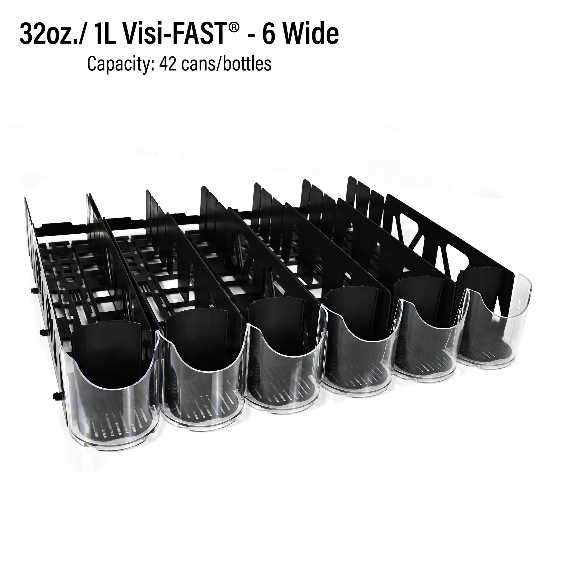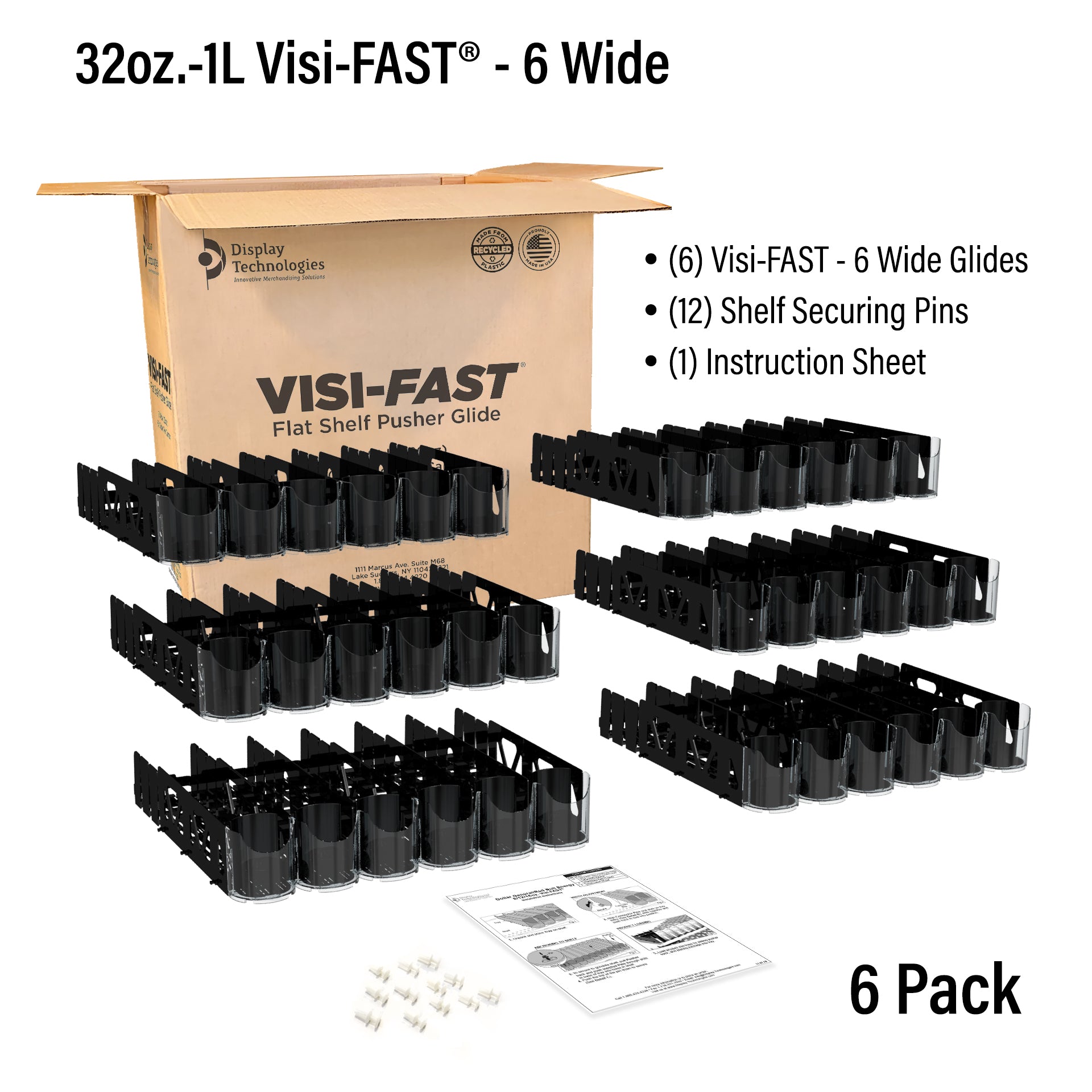 (Pack of 6) The Visi-FAST® pusher merchandising system is designed specifically for flat shelf applications in coolers or gondola shelving. Pre-molded to common gondola shelf depth of 22", enables carton-to-shelf installation, reducing install labor as well as reducing material waste. Break-offs and re-attachable back walls allow this system to work on 16", 18' and 20" shelf depths. Features such as spring loaded pushers, clear scooped front lens, tall side walls and interconnectivity make Visi-FAST® the ideal flat shelf solution for single serve beverages.